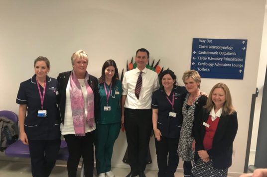 From left: Alicia Hayley Bell, Specialist Nurse for Organ Donation; Christina Colleer, donor relative; Dr Ashleigh Sherrington, Clinical Lead for Organ Donation; Jeremy Hunt, Secretary of State for Health; Jo Cox, Specialist Nurse for Organ Donation; Abi Essex, donor relative; Kathryn Harrison, Lead Governor and living donor.