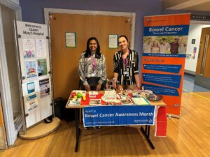 On the 2nd and 28th of April, Jennifer and Radha hosted awareness stands at Queen Mary’s Hospital to raise awareness of bowel cancer and the screening programme.